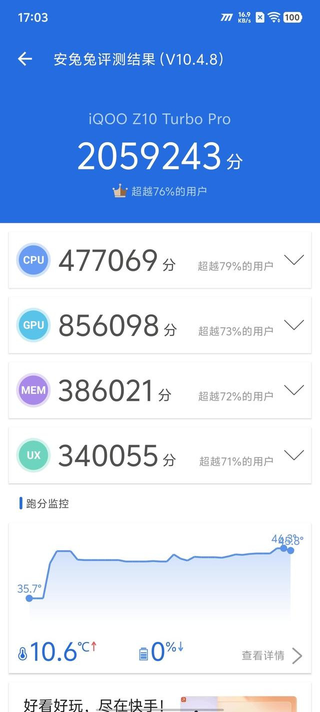 1 性能:双芯协同的“冷静”爆发 iQOO Z10 Turbo Pro的性能配置堪称同价位机型中的“降维打击”。其核心搭载的第四代骁龙8s处理器,采用台积电4nm制程工艺,CPU架构升级为1个X4超大核(3.2GHz)+7个不同频率A720大核的四丛集设计,GPU则升级为Adreno 825,官方称整体性能较前代提升约31%。在安兔兔V10版本测试中,iQOO Z10 Turbo Pro取得了205万分的成绩,这样的成绩甚至与部分前代旗舰不相上下。