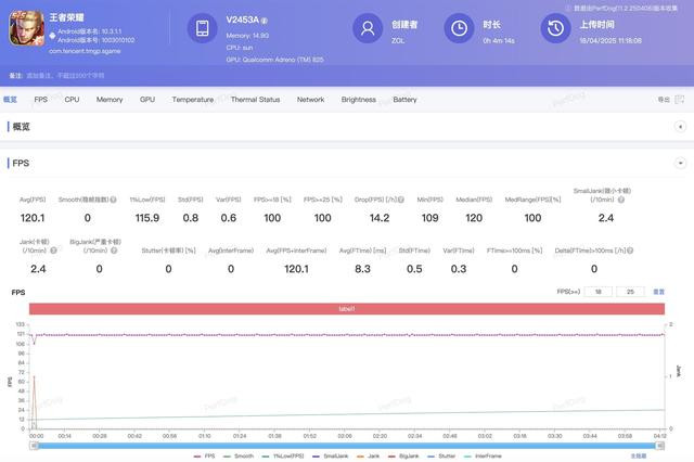 但性能释放的稳定性往往比纸面参数更重要。在《王者荣耀》的实测中,开启超高帧率+高清分辨率选项后,iQOO Z10 Turbo Pro全程保持120帧满帧运行,即便是在后期团战密集的场景,帧率波动也控制在0.5帧以内。